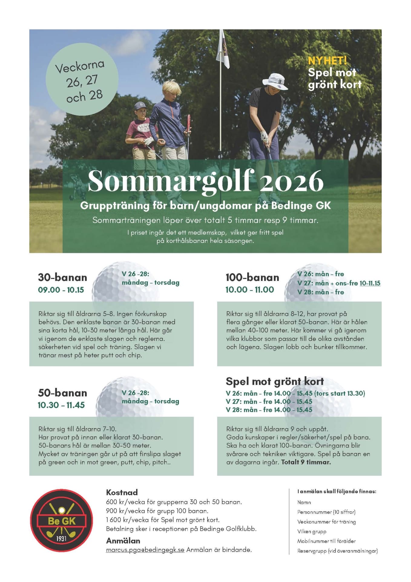 Gruppträning för barn och ungdomar i åldrarna 5-12 år på Bedinge GK. Välj mellan vecka 26, 27 och 28.